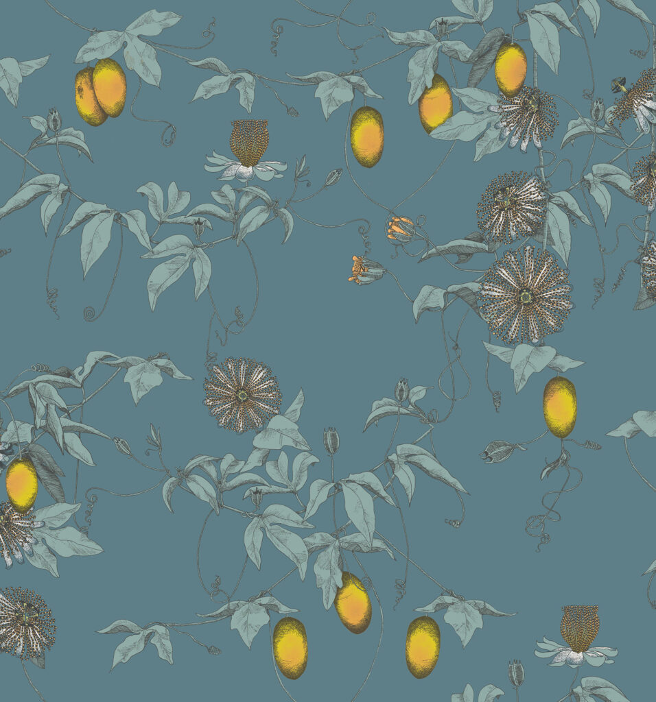 SKARDU – Exquisitely drawn passion flower vines decorate pearlescent grounds, with its unusual blooms and colourful fruits. Inspired by the mythical world of Shangri-La; this collection brings to life the lost world by way of floral metaphors that would have adorned the valleys and surrounding peaks of its snowy mountains.