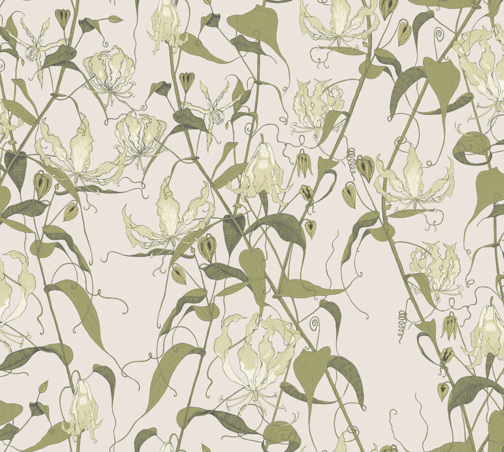GILGIT – Glory vines flourish, creating an exotic trellis and beautiful floral wallpaper with a twist. Inspired by the mythical world of Shangri-La; this collection brings to life the lost world by way of floral metaphors that would have adorned the valleys and surrounding peaks of its snowy mountains.
