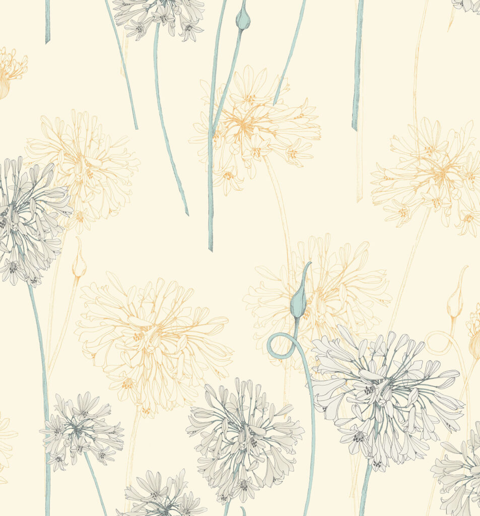 YUNNAN – Big bold Agapanthus flora is all that is required to make this design a stunning addition to the collection, and to any interior wall. Inspired by the mythical world of Shangri-La; this collection brings to life the lost world by way of floral metaphors that would have adorned the valleys and surrounding peaks of its snowy mountains.