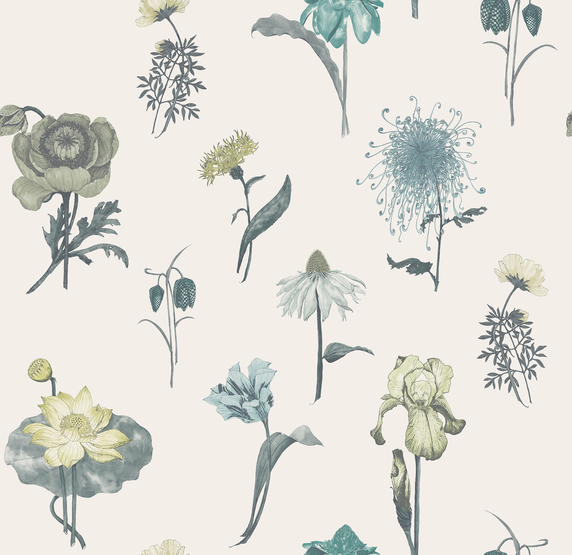 HUNZA – Originally hand painted and then printed, specimen flowers adorn this lovely wallpaper. Subtle colours enhance the natural beauty of the blooms.