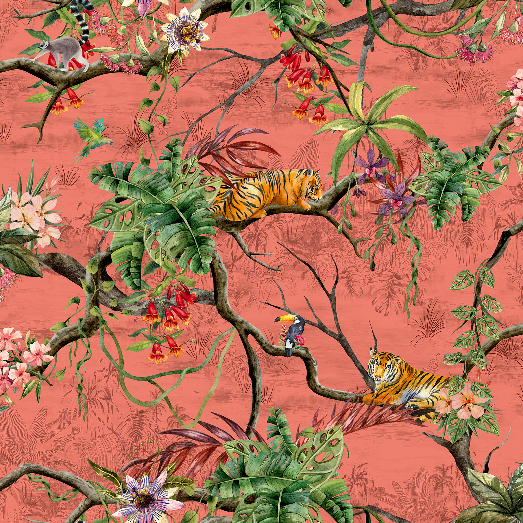 Elevate your space with the bold and dynamic Panthera wallcovering. Featuring majestic tigers lounging amidst vibrant tropical foliage, this design brings a touch of the wild into your interiors. With its lush greenery and striking details, Panthera creates a captivating focal point, perfect for those seeking a nature-inspired aesthetic. Ideal for residential and commercial spaces, this wallcovering is a sophisticated choice for transforming any room